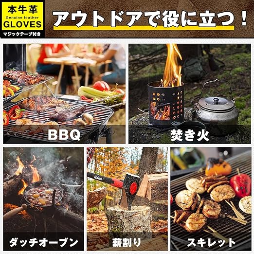 ✅【大活躍本革手袋】バーベキューやキャンプ、アウトドアをする中で、焚き火?炭火調理は欠かせません。そんな時に、ちょっとおしゃれな耐熱手袋は、実用面でもおしゃれなアイテムとしても活躍します。実用面では火力調節のために燃え盛る薪の配置を直すくらいなら余裕で行えます。この耐熱グローブは手首までガードしてくれるので、高熱を防ぎ、焚き火の火起こしやバーベキューの網替え、炭の継ぎ足しなど、安心してバーベキューを楽しむことができます。