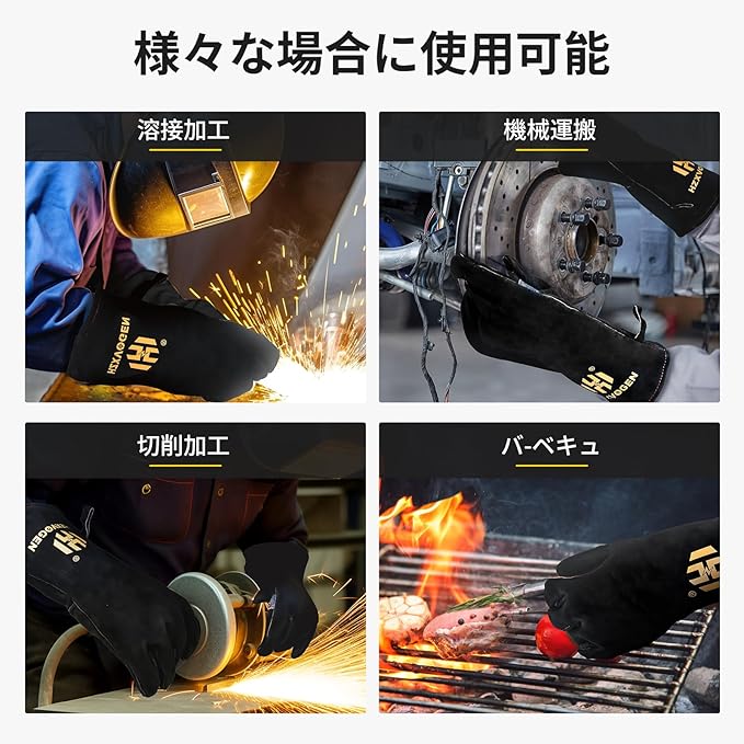 【多様な場合に使用可能】溶接用のグローブとして使えるだけでなく、キャンプ、BBQ、薪ストーブ、園芸、建築、草刈機、チェーンソー、造船業、鉄筋業、土木、焚き火の火起こしやバーベキューの網替え、炭の継ぎ足しなど様々なシーンに適用しています。