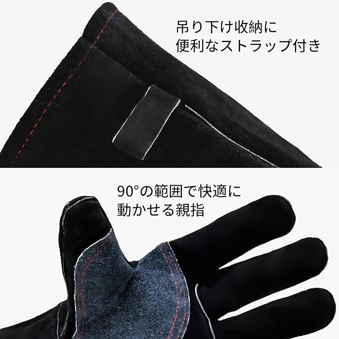 【製品仕様】耐熱手袋は全体に牛革・難燃性素材・綿布の三層構造になっています。サイズ:フリー(長約36CM、幅約18cm)男女兼用。