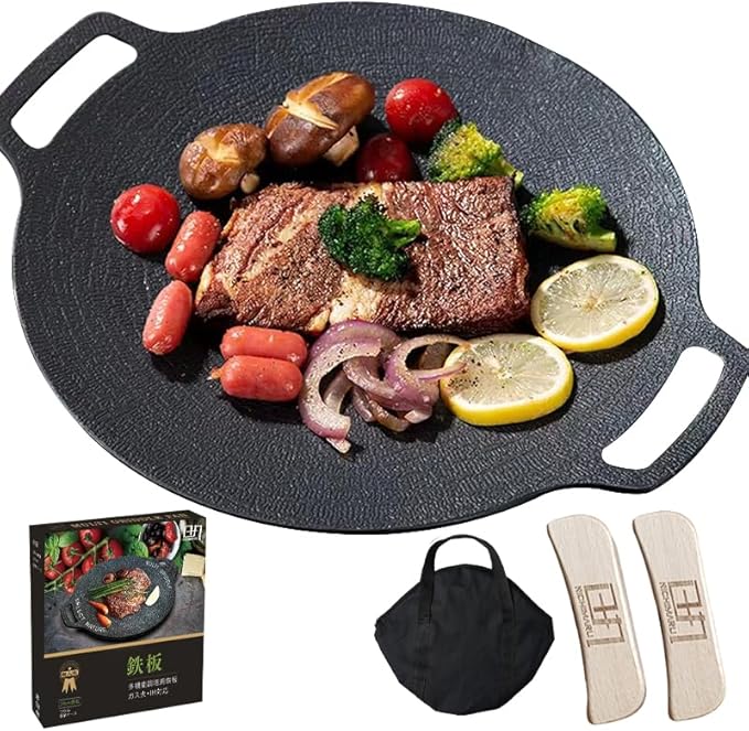 【日丸優品】鉄板 マルチグリドルパン 直径29/33cm IH対応 焚き火 ガス火 バーベキューグリル アウトドア 家庭 グリドルパン ソロキャンプ 軽量 シーズニング不要 お手入れ簡単 取っ手収納バッグ付属 (直径33cm)