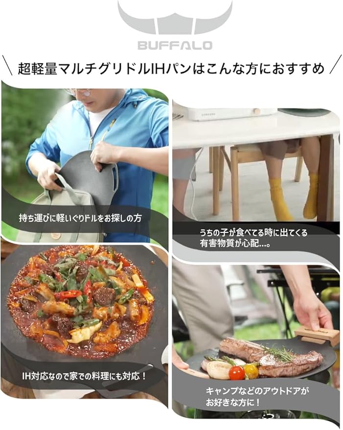 バッファロー マルチグリドル IHパン アウトドアの老舗バッファローが作ると グリドルも違います! ―「シーズニング不要の超軽量グリルドル」 アウトドアの老舗バッファローが作るとグリドルも違います! 調理からプレーティングまでどこでも簡単に!キャンプ場でも家庭でも全ての熱源が使用可能です。 ※熱効率の良いIH調理器、ガスレンジ、ハロゲンなど様々な調理器で使用可能 ●強力なコーティング コーティング力に優れたノンスティックコーティングで 強力な耐久性を持っています。 ●油不要、焦げ付きにくい! 「年輪」のような模様の オイルロードで食べ物が 焦げ付かず、洗浄が楽です。 ●傷・摩擦に強い! 傷、摩擦、スクラッチに強く コーティング維持期間が長いです。 ●料理が美味しくなる 4T最適の厚さで耐久性を強化 。熱伝導が早い! ●安心してお使いいただけます。 PFOA・PFOS等、不検出テスト済み ●多様な熱源に対応! 対応熱源:ガス、IH調理機、直火、炭火、 ラジエントヒーター、セラミックヒーター、ハロゲンヒーター