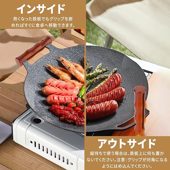 【火傷防止設計】「くり抜き」の場合、横方向への滑りが少なくなります。しっかりとした安定感があり、取っ手を挟んだ状態でグリドルパンを90 傾けても揺れなく安定して使えます。縦持ちで使う場合は、鉄板に中身が入っていない状態で持ち上げてください。また、グリップが対角になるようにはめ込んでください。