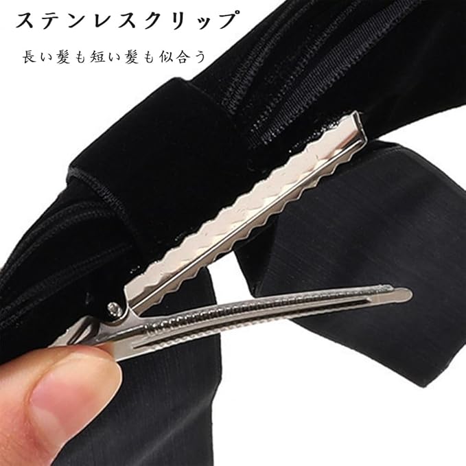 【トレンディなブラックヘアリボン】ベーシックでありながらスタイリッシュ、ソフトで心地よい手触り。エレガントなベルベット素材が、このヘアリボンワニ口クリップをすべての女性のクローゼットの定番にしています。普段使いはもちろん、フォーマルな装いに華を添えるマストアイテムのヘアリボンアクセサリーです。