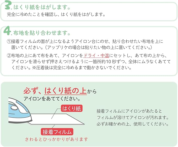 ※接着フィルム(さわるとひっかかりがあります)にアイロンが当たるとフィルムが溶けてアイロンが汚れます。