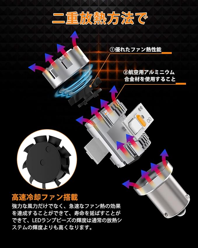 【長い寿命&抜群の放熱性】冷却ファン付き、優れる耐熱性放熱性:進化したLEDウインカーは高速静音の冷却ファンが搭載されていて、バルブの全体にも航空用のアルミ合金素材を採用しているので、耐熱性放熱効果が抜群になるため、安定した発光が可能です、また、熱に弱いLEDチップも保護でき、長寿命、長持ちが実現できます。