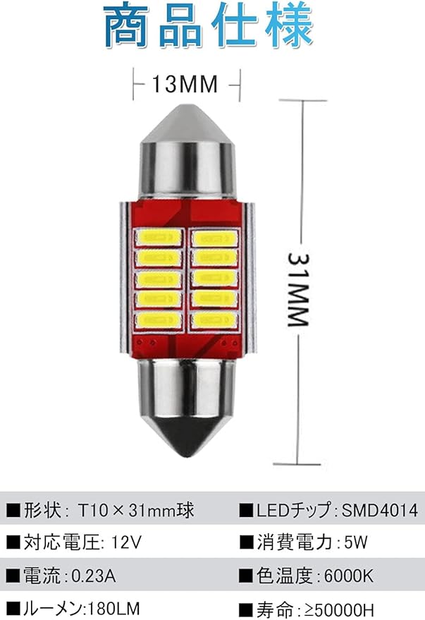 T10 31mm LED ルームランプ ホワイト キャンセラー内蔵 T10 31mm 10SMD LEDトランク ルーム バルブ マップランプ 室内灯 車内灯 ラゲッジランプ ナンバー灯 汎用 LEDバルブ 12V 6500K 車用 無極性 エラーフリー 両口金タイプ LEDライト 50000時間長寿命