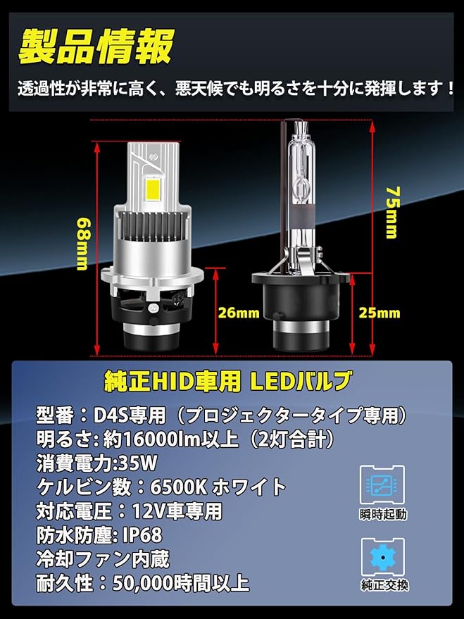 【正規品】D4S ledバルブにノイズキャンセラーを内蔵し、電磁干渉を防ぎます!車内のラジオで騒音や干渉もなく、安心して運転できます。安定した性能の逸品です!保証期間は2年なので、耐久性の心配はありません。安心してご購入いただけます。《製品情報》D4S専用LEDバルブ/ケルビン数:6500K ホワイト/消費電力:35W(片方)/12V車用/寿命:約50000時間以上※※アフターサービスについては、注文を通じて直接ご連絡ください。私たちはあなたに満足できる解決策を提供します。