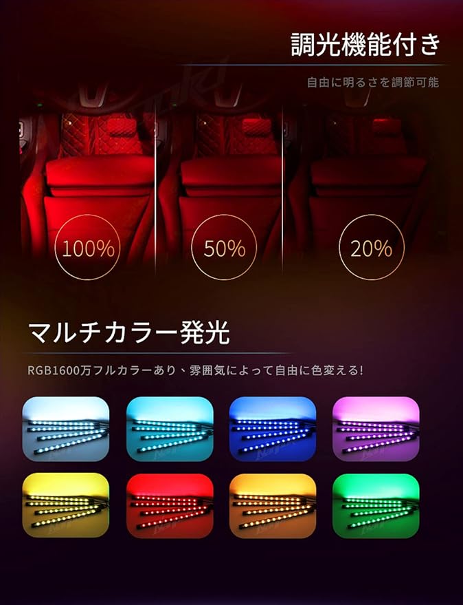 Nanpoku 車 LEDテープライト USB&シガーソケット 2種給電 車内装飾用 防水 高輝度 音に反応 RGB 8色切替 多種フラッシモード 4パターン点灯 フットライト 足下照明 リモコン付き