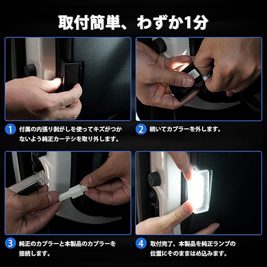 簡単装着、車両に無損害:Alphard・Vellfire40のカーテシランプは、カプラーON設計により、専門知識がなくても簡単に取り付け可能。車両の配線を傷つけることなく、付属の工具で60秒で装着完了。純正状態に簡単に戻せます。