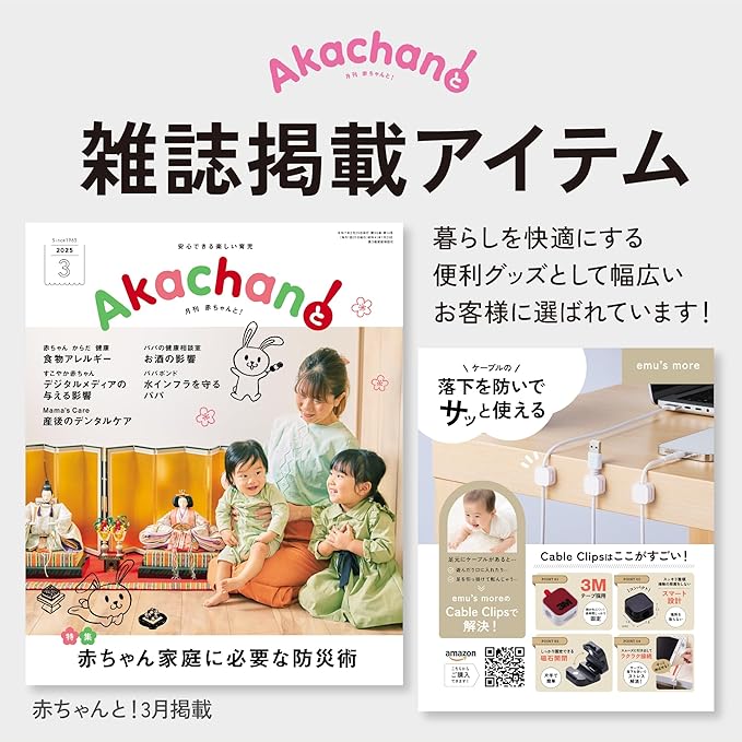 【多くの方に選ばれる理由】 「emu’s more」のケーブルクリップは、日常の整理整頓をサポートし快適な暮らしをするために考えられたアイテムです。高粘着力の3Mテープを採用し、長くお使いいただける耐久性が魅力。また、スリムな1.8cm 1.8cmのスクエア型デザインは、空間に馴染みやすく、日本で企画・販売されている信頼性の高さも魅力です。