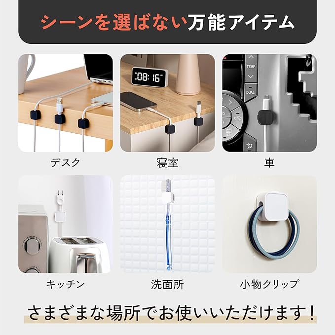【活用シーン】 ️デスク: 作業中のケーブルを整頓し、見た目もスッキリ。効率的な作業環境を作ります。 ️寝室: ベッドサイドの充電ケーブルを簡単に整理。夜間も絡まることなく快適。 車内: ナビやスマホの充電ケーブルを固定し、運転中も安全に管理。 キッチン: 家電コードをまとめて収納。調理中のストレスを軽減します。 洗面所: 歯ブラシや小物をスッキリ固定。清潔感のある空間をキープできます。 emu's moreのケーブルクリップは日々のさまざまな場面で活躍する頼れるアイテムです。 どんな場所でも簡単にケーブルを整え、快適で効率的な生活をサポートします。
