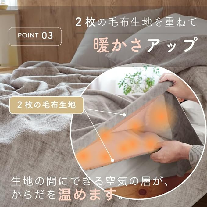 【空気を含む構造で軽さと保温性を両立】2枚合わせ仕様で間に空気層を持たせることで、軽やかな掛け心地とともに暖かさをしっかりキープ。重さを感じさせず、長時間包まれても快適です。