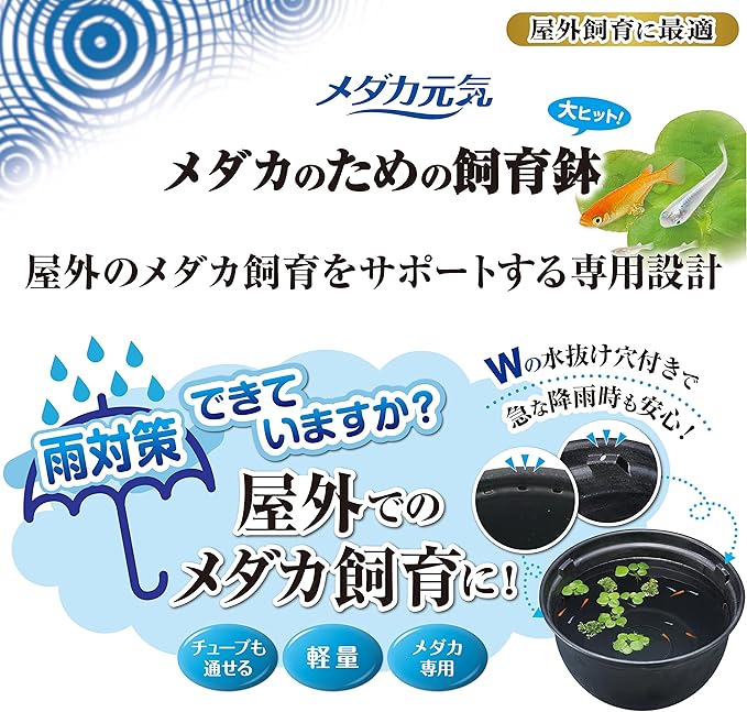 屋外飼育に最適! 急な降雨時に稚魚や親魚を守る2ヶ所の水抜け穴構造で、屋外でも安心して飼育できます。