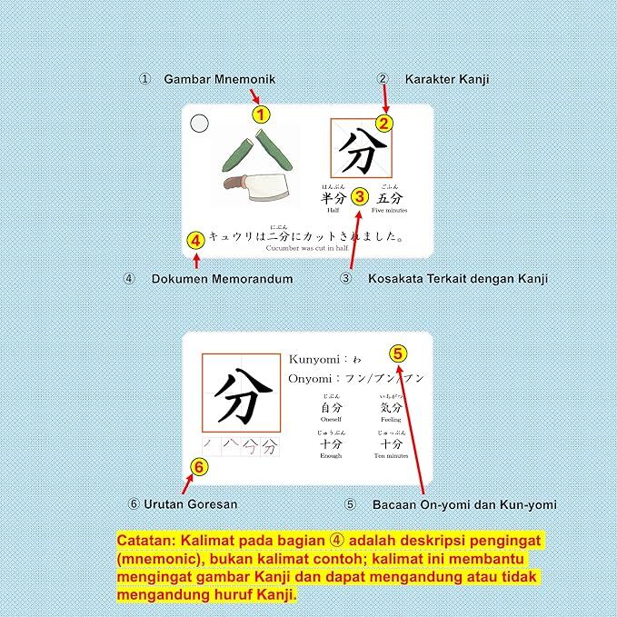Catatan: Kalimat pada bagian ④ adalah deskripsi pengingat (mnemonic), bukan kalimat contoh; kalimat ini membantu mengingat gambar Kanji dan dapat mengandung atau tidak mengandung huruf Kanji.