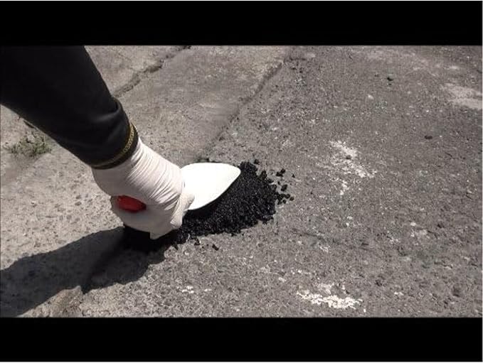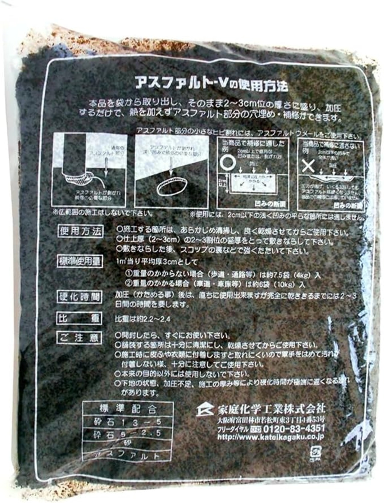 袋から取り出し、そのまま2~3cm位の厚さに盛り、スコップの裏などでたたく(かためる)だけで、熱を加えずに手軽に舗装補修や穴ウメができます。
