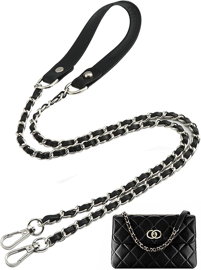 [VEAGIA] ショルダースト ショルダーストラップ バッグ用 チェーンショルダーストラップ ショルダーバッグ ひも バッグ修理 交換用 持ち手ストラップ ショルダースト 単品 ラップ バッグ用 約120cm (レザー(一部) 黒+銀)