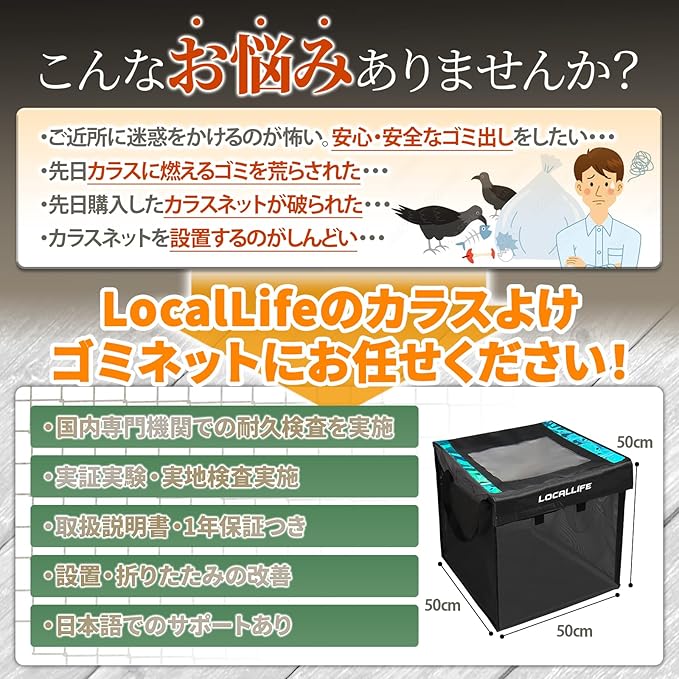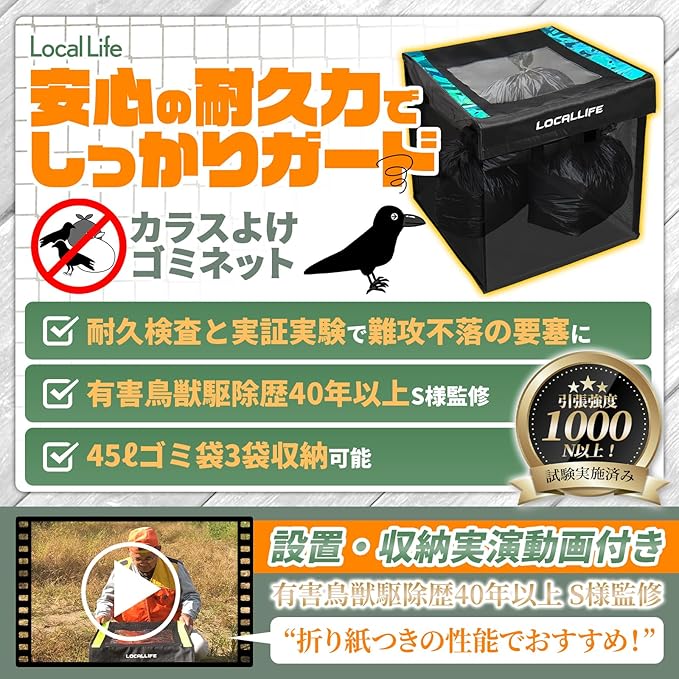 LocalLife ゴミネット カラスよけネット 屋外 戸別回収向け からすよけ 45ℓ 3袋収納可能 実証実験済み 鳥 野良猫 対策 耐久検査合格 簡単 設置 収納