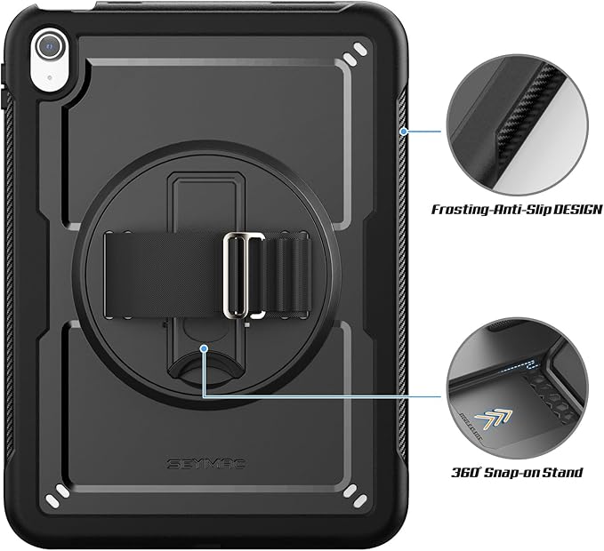 SEYMAC stock iPad A16 第11世代11インチ/第10世代10.9インチ専用ケース 耐衝撃 Gフック式ハンドストラップ 360 回転スタンド ペン収納 ショルダーストラップ フィルム付き前面フレーム 全面保護カバー (ブラック)