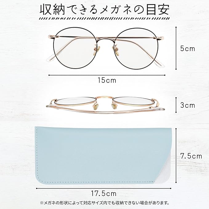 【多機能性と用途の広さ】薄型でスリムながらも、サングラスや老眼鏡にも対応しています。さまざまな種類のメガネを効率的に収納することが可能で、一つあれば非常に便利です。また、メガネを収納しても薄さは約3cmと、非常にコンパクトなので小物入れやミニポーチにも収納可能です。