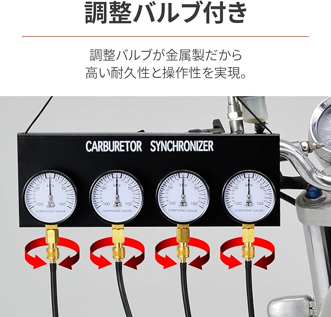 寸法:全長300mm 全幅150mm。ゲージ径φ65。測定範囲:-100~100kPa(10~5kPa刻み)。 〈セット内容〉 本体(調整バルブ付き)、アタッチメント(真鍮製):169 φ4 4本(先端部テーパー)、アタッチメント取付ネジ寸法:M5 P0.8、M6 P0.75(※M6 P1.0はヤマハ純正のものを使用してください。)、ビニールホース:φ5 φ8 950 4本、Oリング(アタッチメント用):M5用・M6用 各4個 ●使用時は調整バルブを必ず全閉にし、エンジンを始動。調整はサービスマニュアルに従って行ってください。 ●水平状態ではゼロ点はズレる場合があります。必ず垂直でご使用ください。