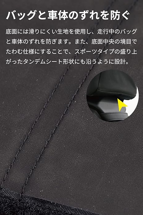 【 バッグと車体のずれを防ぐ 】 底面には滑りにくい生地を使用し、走行時にバッグが車体からずれることを防ぎます。 また、底面の境目でたわむ仕様にすることで、一部車両の盛り上がったタンデムシート形状にも沿うように設計。