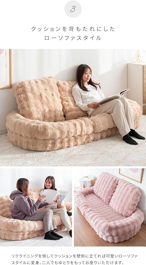 リクライニングを倒してクッションを壁側に立てれば可愛いローソファスタイルに返信。二人でもゆとりを持ってお座り頂けます。