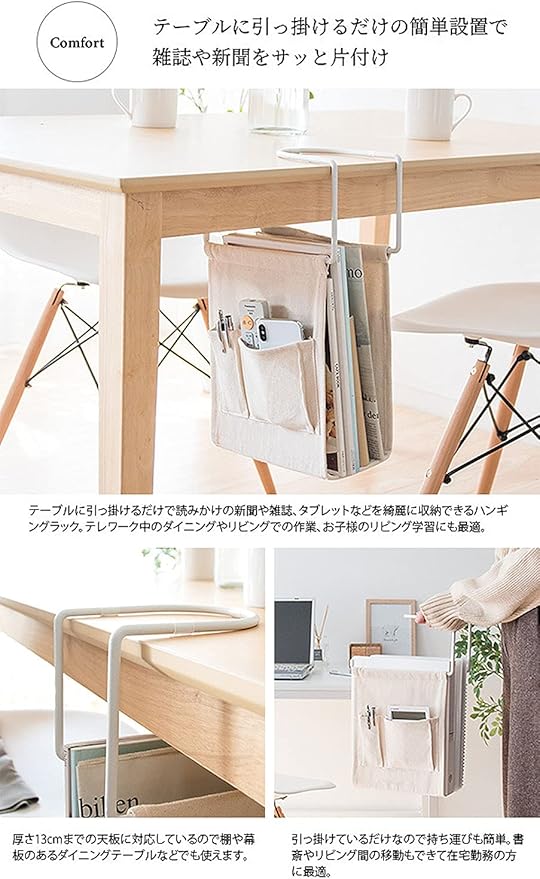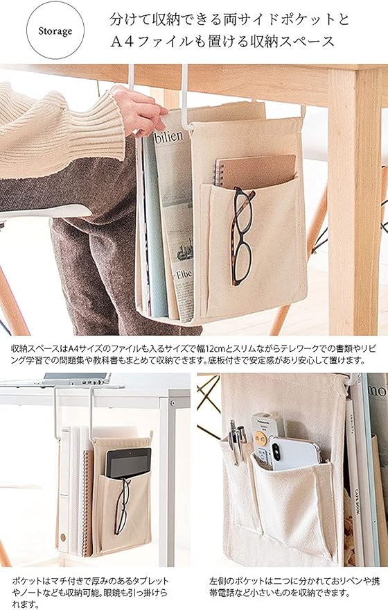 ダイニングテーブルやデスクに引っ掛けるだけで新聞や雑誌が収納できる帆布ケースのハンギングラック