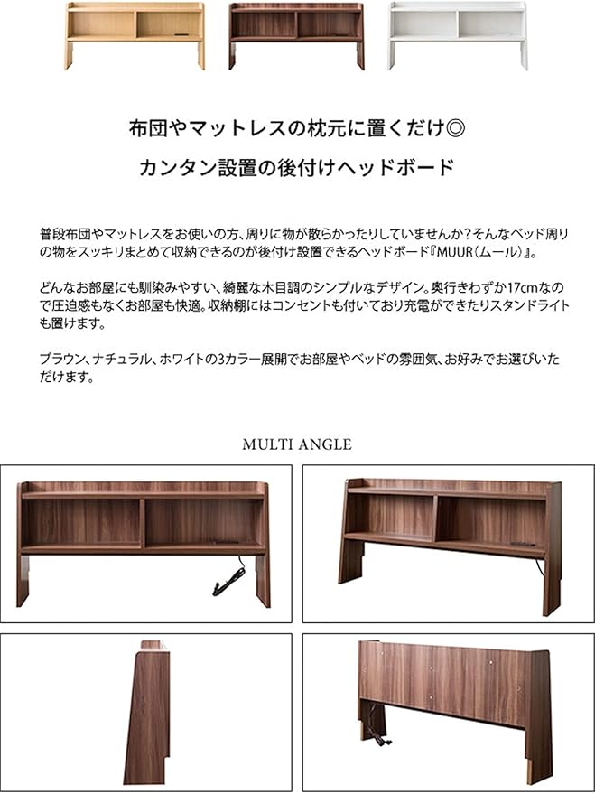 普段布団やマットレスをお使いの方、周りに物が散らかったりしていませんか?そんなベッド周りの物をスッキリまとめて収納できるのが後付け設置できるヘッドボード『MUUR(ムール)』。(a)