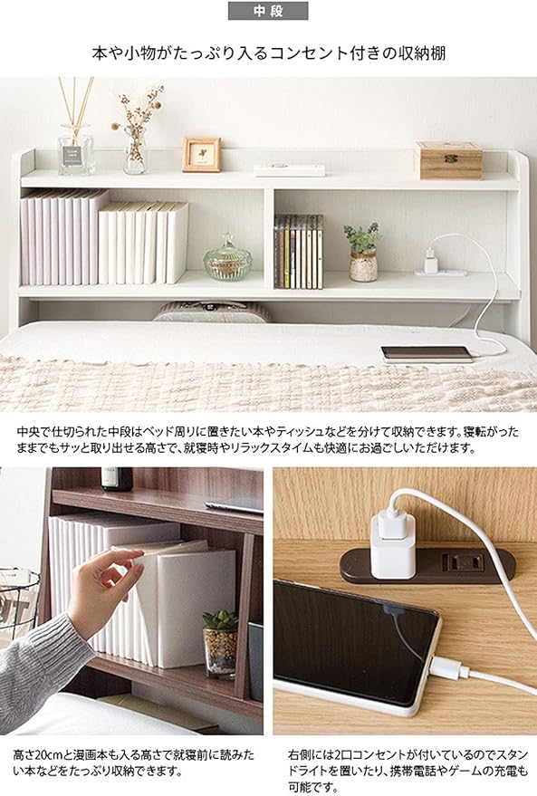 どんなお部屋にも馴染みやすい、綺麗な木目調のシンプルなデザイン。奥行きわずか17cmなので圧迫感もなくお部屋も快適。収納棚にはコンセントも付いており充電ができたりスタンドライトも置けます。