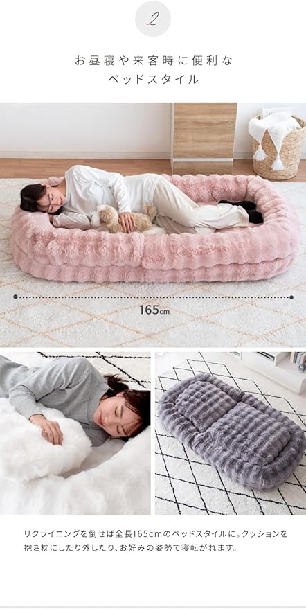 リクライニングを倒せば全長165cmのベッドスタイルに。クッションを抱き枕にしたり外したり、お好みの姿勢で寝転がれます。