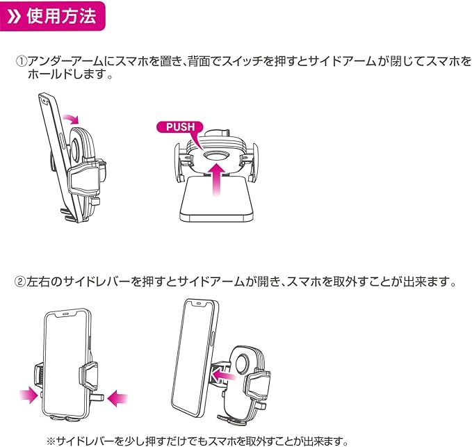スマホを押し当てるだけのワンタッチホールド式スマホホルダーです。手帳型ケースにも対応。サイドレバーを少し押すだけで、スマホの取外しが可能です。