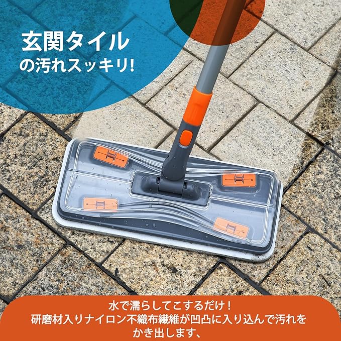 【1台3役タイルブラシ&フロアモップ&フロアワイパー付き設計】用途に応じて使い分けができる2種類のモップパッドを付いて、床の拭き掃除だけでなく、玄関タイル、お風呂場掃除、濡れら床面を水切りすることも楽々。