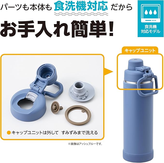 素材・材質:内びん:ステンレス鋼 / 胴部:ステンレス鋼(アクリル樹脂塗装)/ フタ・ループ・キャップ本体・飲み口:ポリプロピレン / フタパッキン・シールパッキン・ボディリング・ソコカバー:シリコーンゴム