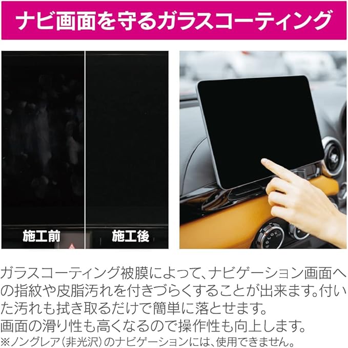 ◆日本市場で長年に渡り実績のある自動車洗車用品&車内アクセサリーHOTの「ペルシード社(愛知県)」が展開。国内ドライブレコーダー製造HOT「コムテック社」の100%子会社。ガラスコーティング被膜によって、内装ブラックパネルに艶と光沢を与えると同時に、キズと汚れを付きづらくすることが出来ます。新車に施工することで、美しさを維持。ガラスコーティング被膜によって、ナビゲーション画面への指紋や皮脂汚れを付きづらくすることが出来ます。付いた汚れも拭き取るだけで簡単に落とせます。画面の滑り性も高くなるので操作性も向上します。※ノングレア(非光沢) のナビゲーションには使用できません。スマホ・タブレットでも使用可