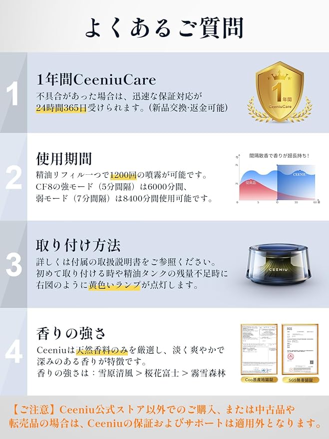 【CeeniuCare付き】精油タンクには180日間の「CeeniuCare」保証サービスが付いており、万が一不具合があった場合は迅速な保証対応が24時間受けられます。
