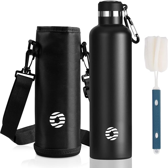 FJbottle 水筒 1リットル 真空断熱 保温 保冷 第2世代 ステンレスボトル 直飲み スポーツボトル スポーツ飲料対応 水筒カバー 洗浄用スポンジ付き 男の子 女の子 大人 子供 ブラック