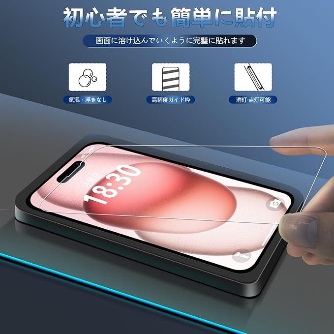 【対応機種】iPhone 15 専用設計(6.1インチ)。画面ガラスフィルム2枚※注:この機器は周辺部が曲面となったラウンド仕様のため、保護フィルムを端まで貼ることができません。本製品はiPhone 15 にのみ適用されます。