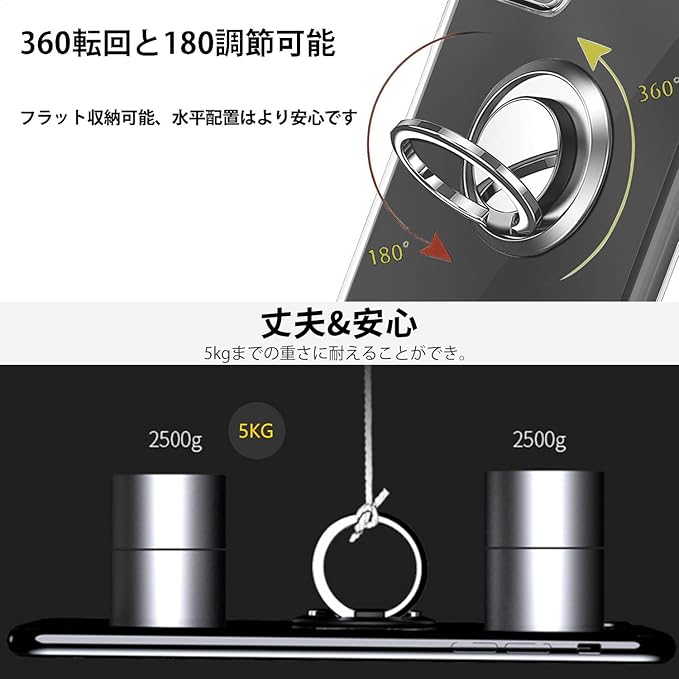 【スタンド機能 & 車載ホルダー対応】後ろに付いているフィンガーリングはスタンド機能はもちろん、滑りにくくて持ちやすい、安定的なグリップが特徴です。リングはケースにしっかり固定されていて、縦置き、横置きどんな角度でも固定できます。360度回転可能、180角度調節可能、携帯電話でビデオを見るのはとても便利です