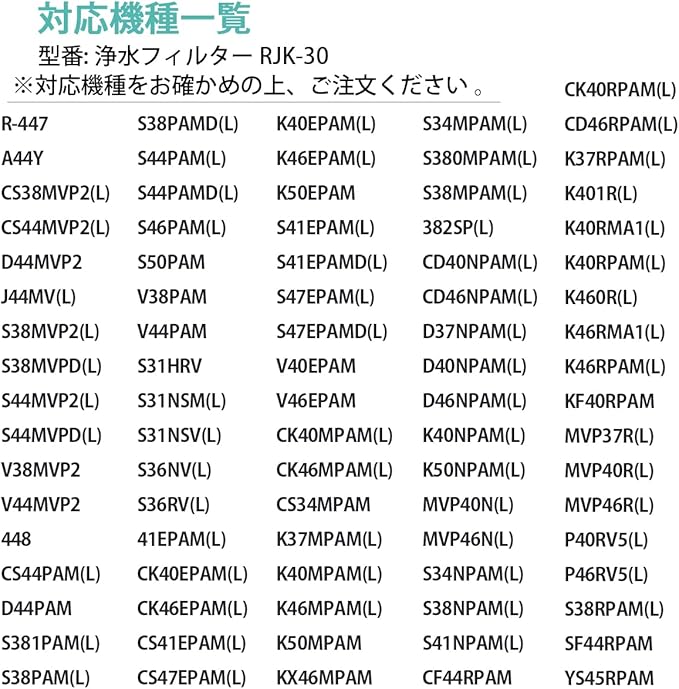 rjk-30 の対応冷蔵庫一覧(タテ形給水タンク使用野菜中心蔵タイプ): R-447、A44Y、CS38MVP2(L)、CS44MVP2(L)、D44MVP2、J44MV(L)、S38MVP2(L)、S38MVPD(L)、S44MVP2(L)、S44MVPD(L)、V38MVP2、V44MVP2、448、CS44PAM(L)、D44PAM、S381PAM(L)、S38PAM(L)、S38PAMD(L)、S44PAM(L)、S44PAMD(L)、S46PAM(L)、S50PAM、V38PAM、V44PAM、S31HRV、S31NSM(L)、S31NSV(L)、S36NV(L)、S36RV(L)、41EPAM(L)、CK40EPAM(L)、CK46EPAM(L)、CS41EPAM(L)、CS47EPAM(L)、K40EPAM(L)、K46EPAM(L)、K50EPAM、S41EPAM(L)、S41EPAMD(L)、S47EPAM(L)、S47EPAMD(L)、V40EPAM、V46EPAM、CK40MPAM(L)、CK46MPAM(L)、CS34MPAM、K37MPAM(L)、K40MPAM(L)、K46MPAM(L)、K50MPAM、KX46MPAM、S34MPAM(L)、S380MPAM(L)、S38MPAM(L)、382SP(L)、CD40NPAM(L)、CD46NPAM(L)、D37NPAM(L)、D40NPAM(L)、D46NPAM(L)、K40NPAM(L)、K50NPAM(L)、MVP40N(L)、MVP46N(L)、S34NPAM(L)、S38NPAM(L)、S41NPAM(L)、CF44RPAM、CK40RPAM(L)、CD46RPAM(L)、K37RPAM(L)、K401R(L)、K40RMA1(L)、K40RPAM(L)、K460R(L)、K46RMA1(L)、K46RPAM(L)、KF40RPAM、MVP37R(L)、MVP40R(L)、MVP46R(L)、P40RV5(L)、P46RV5(L)、S38RPAM(L)、SF44RPAM/YS45RPAM ※ご購入の前にご希望商品の対応機種一覧より、適合商品である事をご確認願います。※購入検討商品に関してご不明な点やご不安をお持ちのお客様は、ご購入前にお問い合わせください。