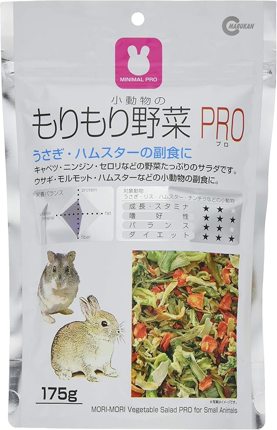 商品紹介 キャベツ・ニンジン・セロリなど野菜たっぷりの小動物用サラダ。うさぎ・ハムスターなどの副食にぴったりです。 使用上の注意 与える量は、ペットの大きさ・年齢・体重・性質に合わせ様子を見ながら調整して下さい。 原材料・成分 粗タンパク質:10.7%以上、粗脂肪:1.7%以上、粗繊維:10.5%以下、粗灰分:8.0%以下、水分:5.8%以下 使用方法 食べ残さない程度に毎日与えてください。 続きを見る