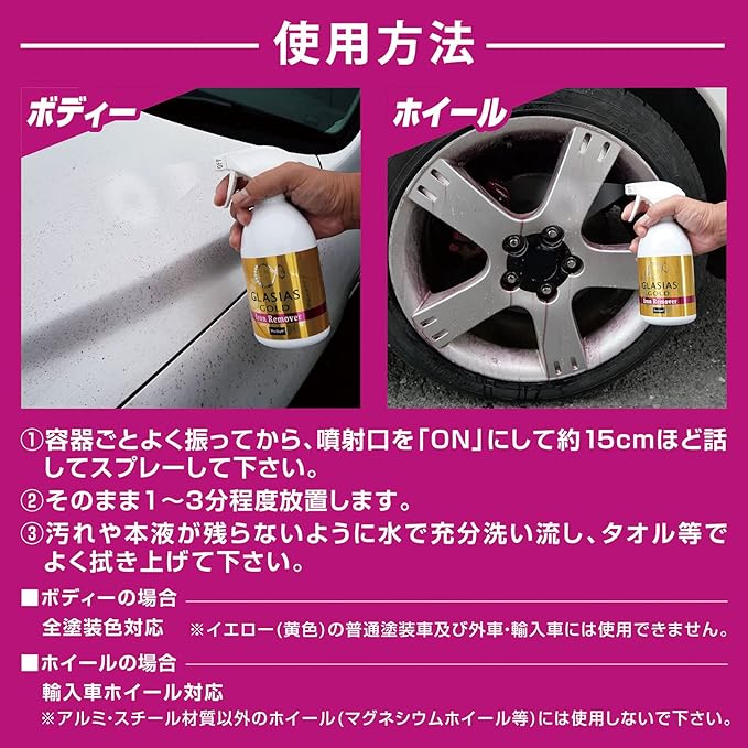 グラシアスゴールドでコーティング施工する前にする下地処理鉄粉除去剤。ジェルが鉄粉に密着し反応してねこそぎ溶かします。鉄粉薬剤特有のイヤな臭いをジェルで閉じ込めるから快適に作業ができる。ボディーの下地を整えることでコーティング効果を最大限発揮させる。ボディー・ホイールに使える。ホイール:アルミ・スチールホイール対応、輸入車のホイール対応ボディー:全塗装色対応※一部使用できない塗装色有り。輸入車のボディーに使えない。