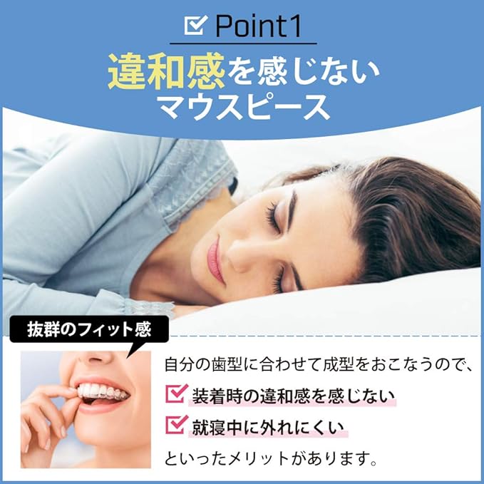 【違和感を感じないマウスピース】Dr.Qolisのマウスピースは、自分の歯型に合わせて成型をおこなうので、装着時に違和感を感じません。フィット感が抜群にいいので、就寝中も外れません。