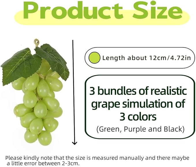 【プラスチック製フェイクフルーツ 3個パック】- このお得なセットには、リアルな人工ブドウ3個。様々な空間を彩るのに十分な量です。プラスチック製フェイクフルーツコレクションは、安全な梱包でお届けします。インテリア、写真撮影プロジェクト、パーティーのテーマをワンランクアップさせましょう。追加購入は不要。必要なものはすべて揃っています!