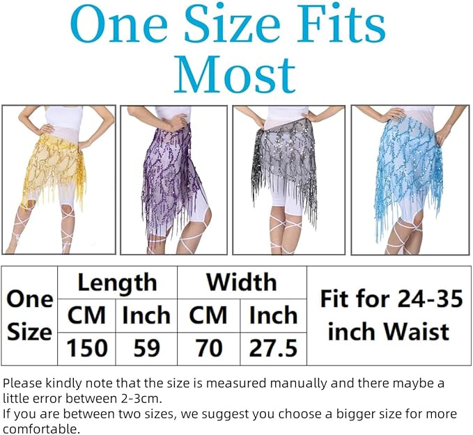 【フリーサイズ】- グリッターフリンジスカートの全長は約150cmで、ウエスト24~35インチにフィットします。幅約70cmで、背の高い女性にも十分な長さです。結び方や調整も簡単で、ほとんどの女性のウエストラインにフィットします。