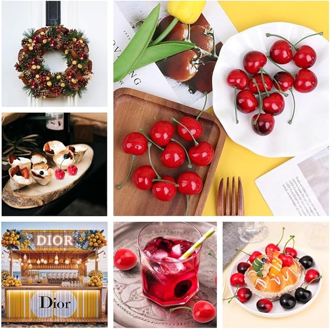 【精巧なフェイクフルーツ】- このリアルな人工フルーツコレクションは、精巧な職人技、精巧な質感、自然な凹凸、そして本物そっくりの色合いが特徴です。本物のチェリーを模倣したこれらのリアルなフェイクフルーツは、鮮やかなフルーツデコレーションをエレガントに演出します。ダイニングテーブル、フルーツボウル、キッチンカウンターなどに最適です。触るまではプラスチック製のフェイクフルーツだとは誰も気づかないでしょう。