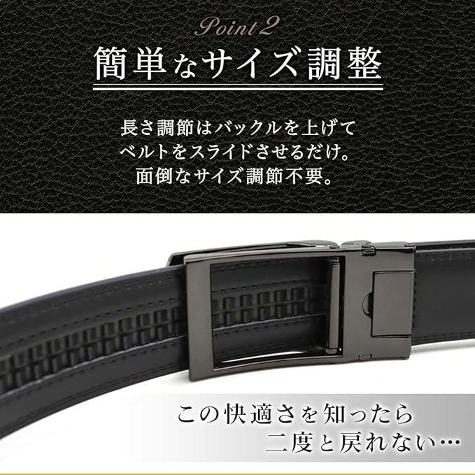 【新型の自動バックル】いつでも微調整ができるオートロックベルト。バックル部分についてるレバーを指で持ち上げるとベルトを引っ張るだけでサイズ調整が可能なクリックベルト。クリックベルトなので、ご使用の便利さは卓抜です。無段階調整で穴なしなので緊急の場合では失礼なく紳士的なイメージを保つことができる紳士ベルト。
