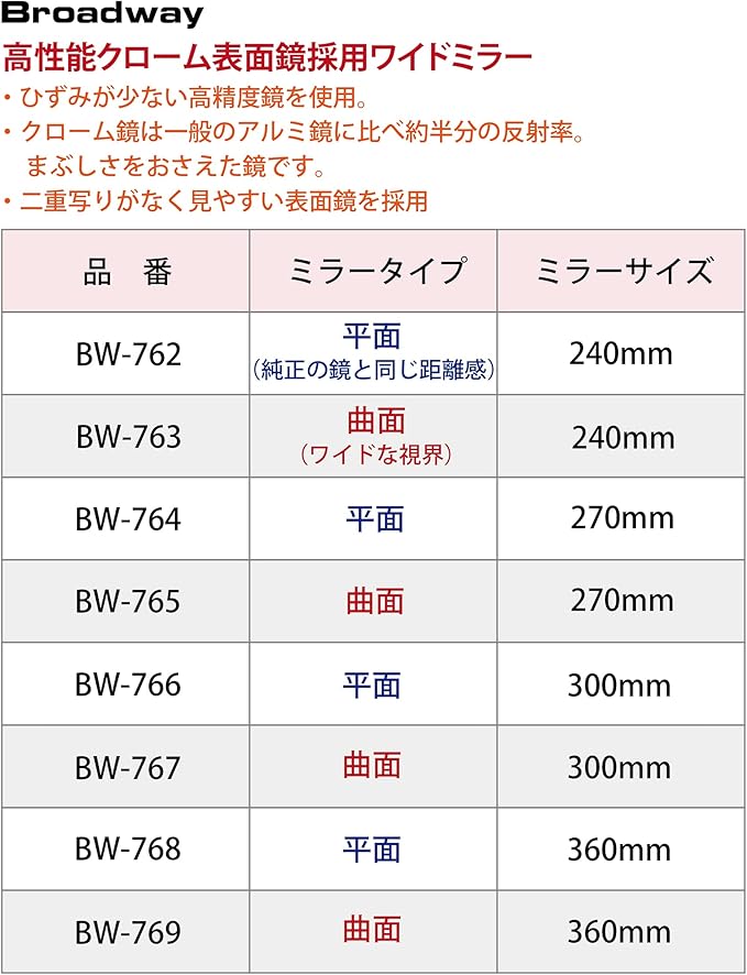■累計出荷数1,000万本を突破。40年の歴史をほこる信頼のBroadway限定商品の高性能ルームミラーが待望のリニューアル。■後続車のライトの眩しさをしっかり抑えるクローム鏡タイプ。■ひずみが少なく、高精度な鏡だけを使用。■一般のアルミ鏡に比べて約半分の反射率。■二重写りがなく、見やすい鏡(表面鏡)を採用。■NBOXやNWGN等に採用されているシートベルト締め忘れ警告灯付きの異形ミラーにも対応した汎用ミラー。■取り付け簡単。純正ルームミラーにスライド部を引っ掛けて挟み込むだけ。■万が一鏡が割れてしまった場合も、破片の飛び散りを抑える飛散防止加工。■サイズ展開は240mm、270mm、300mm。360mmの4タイプ。それぞれに平面鏡と曲面鏡をご用意しております。■サイズ別おすすめ車種・240mm:軽自動車やコンパクトカーに最適・270mm:セダン、クーペ、ステーションワゴン等に最適・300mm:大型セダン、ミニバン、SUV等に最適