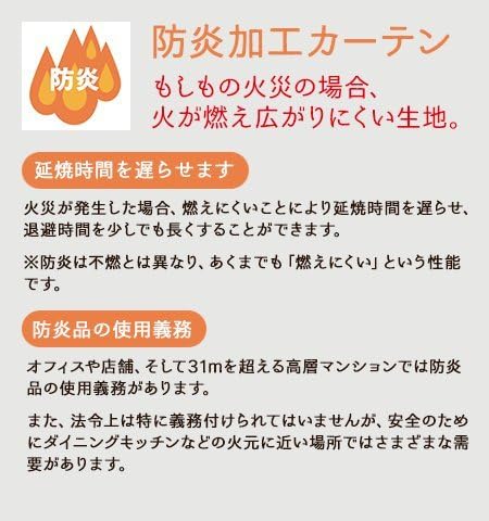 火事が大きく広がる原因のカーテンに燃えにくい糸を使用して防炎加工を施しました。 遮光1級で心地よいライフスタイルのお手伝いをいたします。Mプリーツなので、幅の応用性が高く、既製カーテンでありながらサイズ感の見栄えも◎無地でマットな風合いがお部屋に馴染みやすいです。