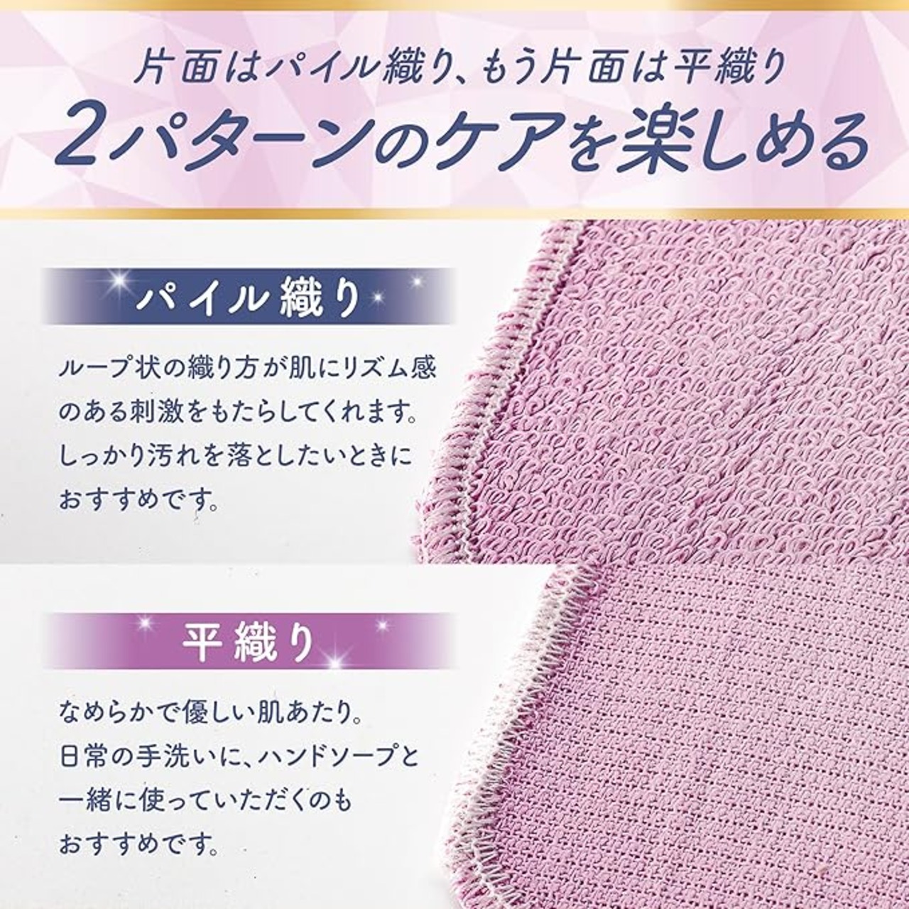 プロテケアネイル協会Ⓡ監修 泉州産タオル生地に、ゴムのコーティングをすることで、お肌の汚れ・角質に対する吸着力・摩擦力を発揮。 コンパクトサイズで小回りが利くので、爪の甘皮・薄皮、指の間、手の甲、足の垢、耳の裏など、細かいところのケアに活躍してくれます。 片面はソフトな平織、もう片面はややハードなパイル地になっています。
