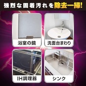 種類:単品 商品紹介 プロが認めた「ウロコ・水アカ用」超強力洗剤。強烈な固着汚れを除去一掃するケタ外れの洗浄力! ●強烈な固着汚れを除去一掃するケタ外れの洗浄力! ●ケタ外れの洗浄力大小2種類の高性能研磨材をダブルで50%以上も高濃度配合。アルカリ性のウロコ・水アカ汚れを中和分解する、酸性のクエン酸を掛け合わせた超強力ハイブリッド処方を採用。●素材を傷つけにくい処方設計。IH調理器にも対応! ●使いやすさを追求したクリームタイプ。低臭化も実現! 浴室・洗面所の鏡・蛇口・陶器タイル・洗面台ボウル、トイレの陶器製タンク・便器、キッチンの蛇口・シンク・IH調理器の天板、その他(自転車、ドアノブの金属部分等)に付着したウロコ(水アカ)・湯アカ・石けんカス・尿石・黒ずみ・コゲ・サビ等のガンコな汚れの除去 品名:クレンザー 液性:酸性 成分:研磨材(52%)、界面活性剤(1%アルキルスルホベタイン)、酸剤、溶剤 使用上の注意 ●用途外に使わない。●必ずゴム手袋等の保護具を着用する。●子供の手の届く所に置かない。●調理器具等は、流水で5秒以上すすぐ。●研磨剤入りスポンジ、金属やナイロンの硬いタワシは、傷がつくので使わない。●使用後は手をよく洗い、手あれが気になる場合はクリームなどでお手入れをする。●洗剤成分に対してアレルギー体質の方は使用を避ける。●凍結するおそれのある場所や直射日光の当たる所、火気の近く、40℃以上の高温になる所には保管しない 原材料・成分 研磨剤(50%)、界面活性剤(3%、ポリオキシアルキレンアルキルエーテル)、酸剤、溶剤 ご注意(免責)>必ずお読みください 〈使えないもの〉曇り止め加工等の特殊加工された鏡、ガラス以外の鏡、すりガラス、 樹脂製の浴そう・浴室床・浴室壁、樹脂製の便器、フッ素・樹脂加工面、塗装面、 プラスチック製品、木製品、石材(人工大理石を含む)、光沢のあるステンレス製品、 漆器、銅・アルミ等の柔らかい金属、金銀等の貴金属製品、金銀等の線模様入り 陶磁器、自動車、水がしみ込む物 ※必ずゴム手袋等の保護具を着用してください。1内容液が分離する場合があるので、よく振ってください。2汚れに直接かけるか、キッチンペーパーや布、スポンジ(過度に柔らかい道具を使うと、本来の洗浄力が得られない場合があります)等に含ませ、こすり洗いします。3洗剤成分が残らないように、充分に水で洗い流すか水拭きします。※ひどい汚れには、厚めに塗り広げて1~2分置いた後、こすり洗いすると効果的です。それでも汚れが残る場合は同じ作業を繰り返してください。※材質によっては傷がつくことがあるので、必ず目立たない所で試してからお使いください。※内容液が分離しても品質には問題ありません。※汚れの程度によって落ちないものもあります。 続きを見る